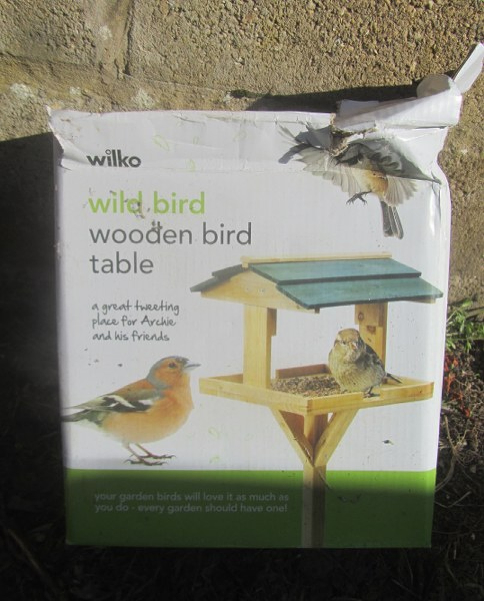 A WOODEN BIRD TABLE. UNUSED, NEW IN A WORN BOX. IT WILL NEED ASSEMBLY.