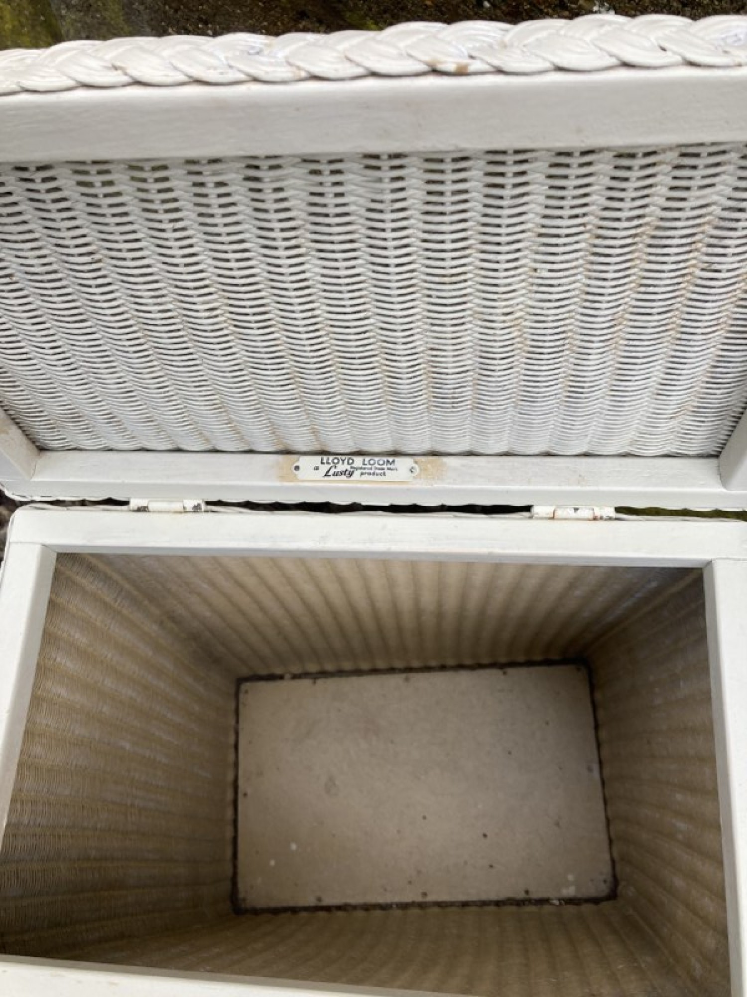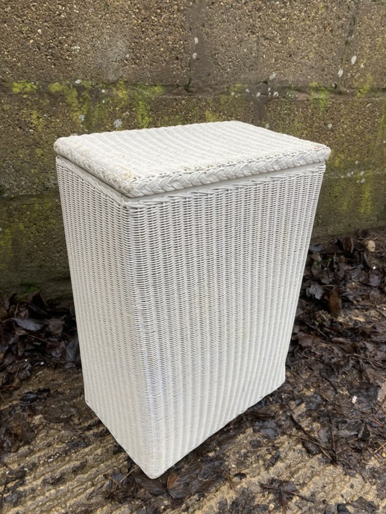 A WOVEN LLOYD LOOM WASH BIN PAINTED WHITE. THE FRAME LOOKS TO BE SLIGHTLY OUT OF SHAPE.