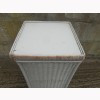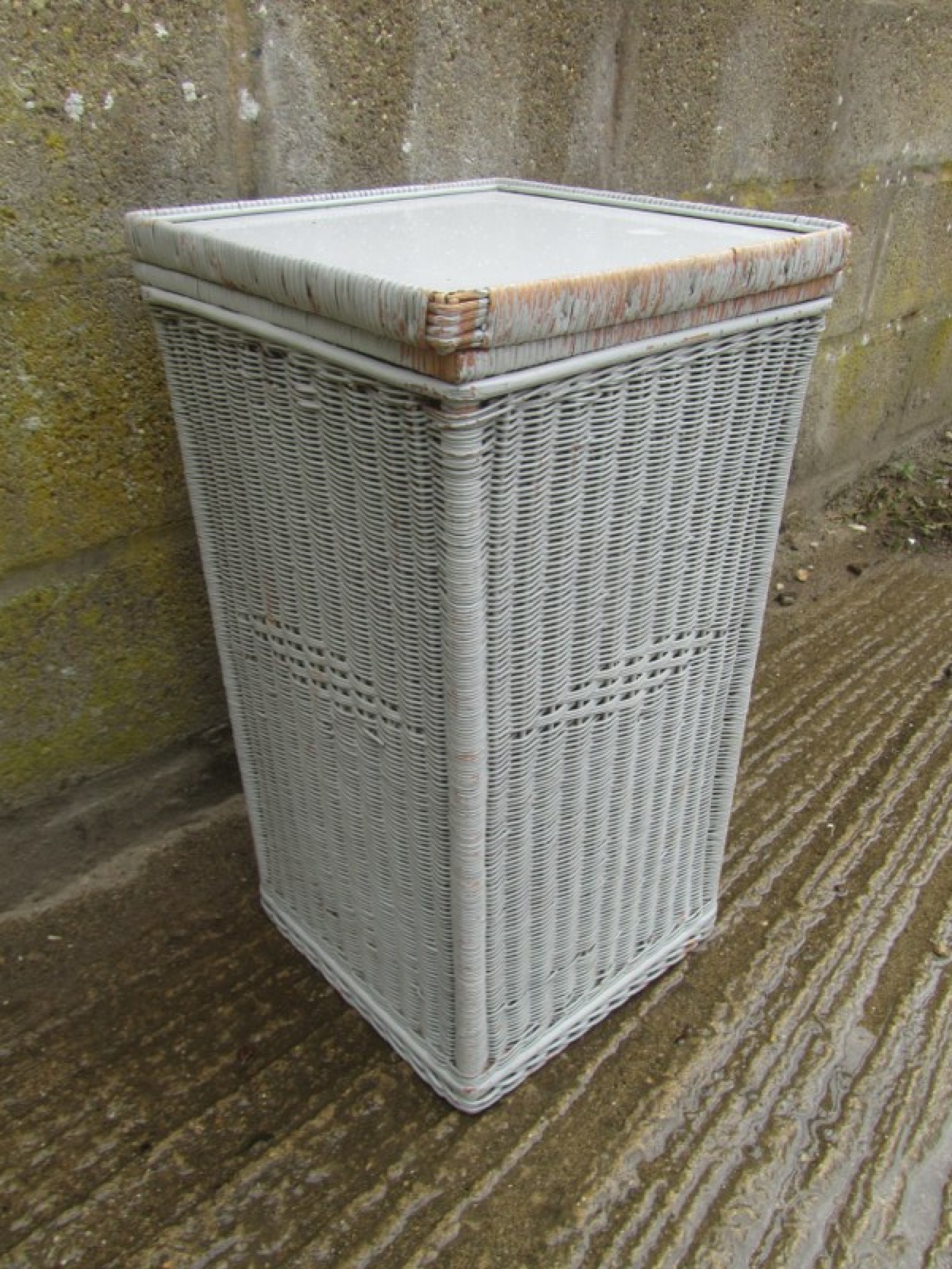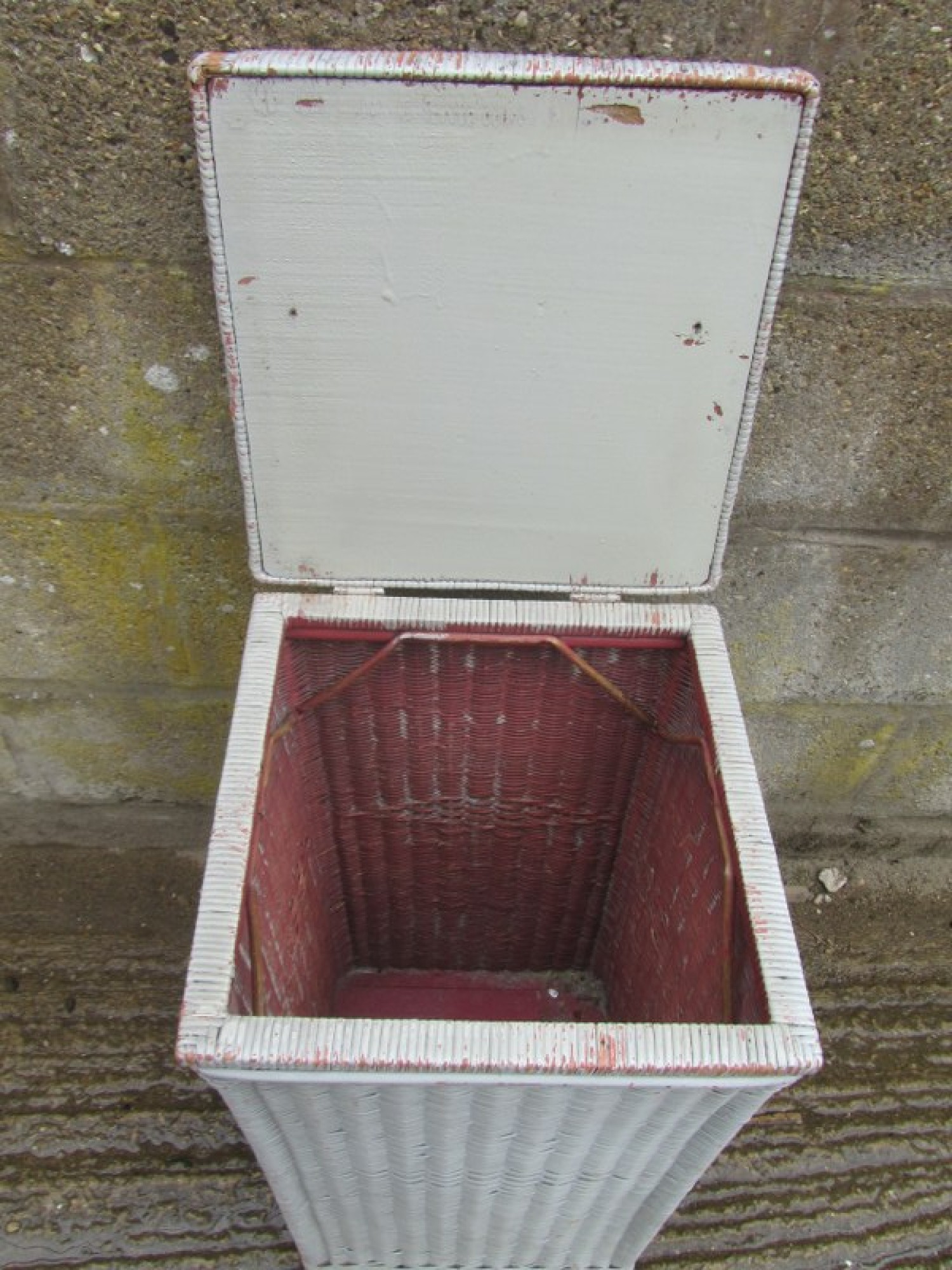 A WOVEN WASH BIN. THE TOP IS PAINTED GLASS.
