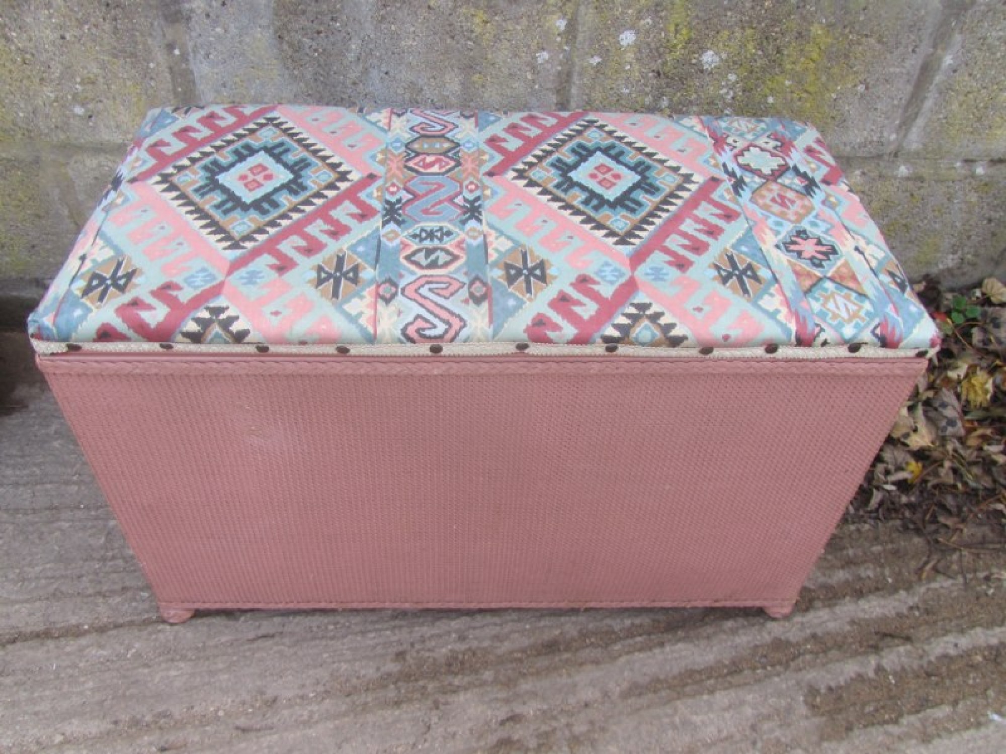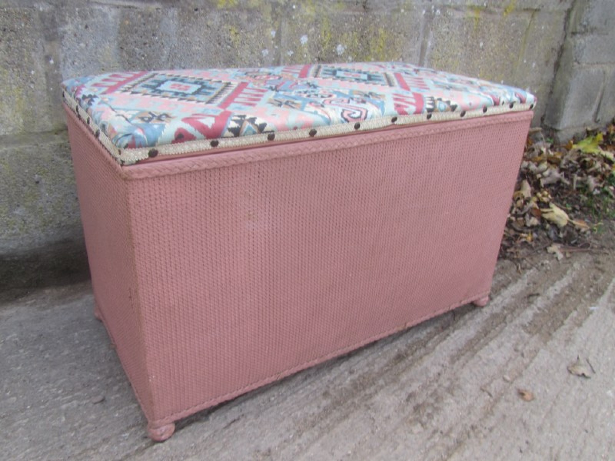 A WOVEN LLOYD LOOM STYLE OTTOMAN. THE TOP IS COVERED IN MATERIAL.