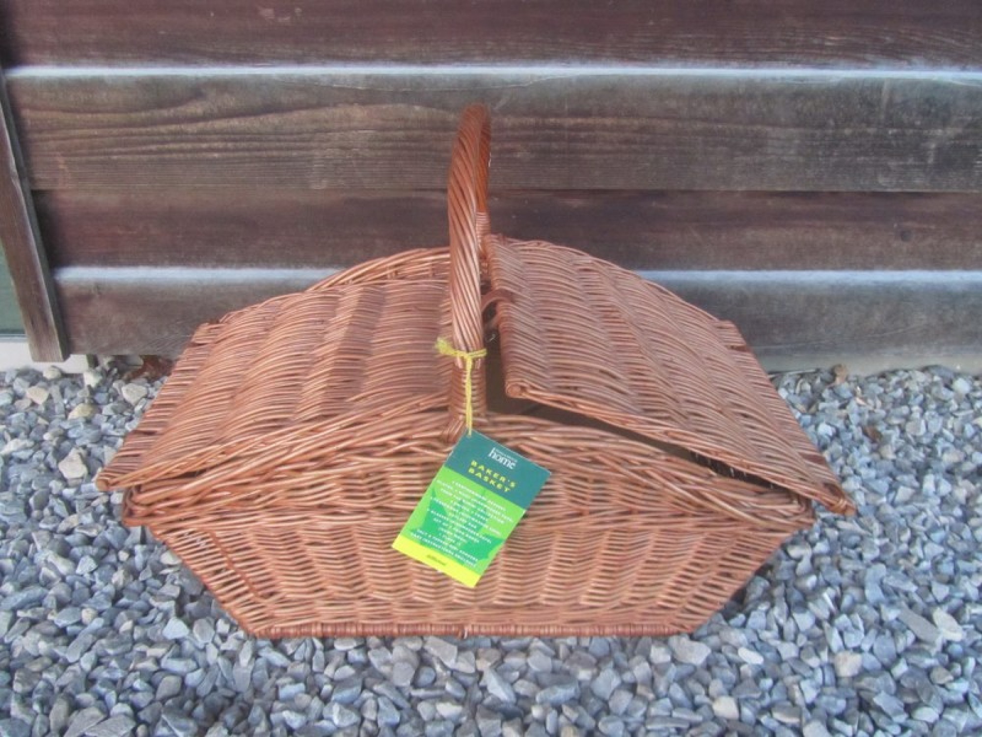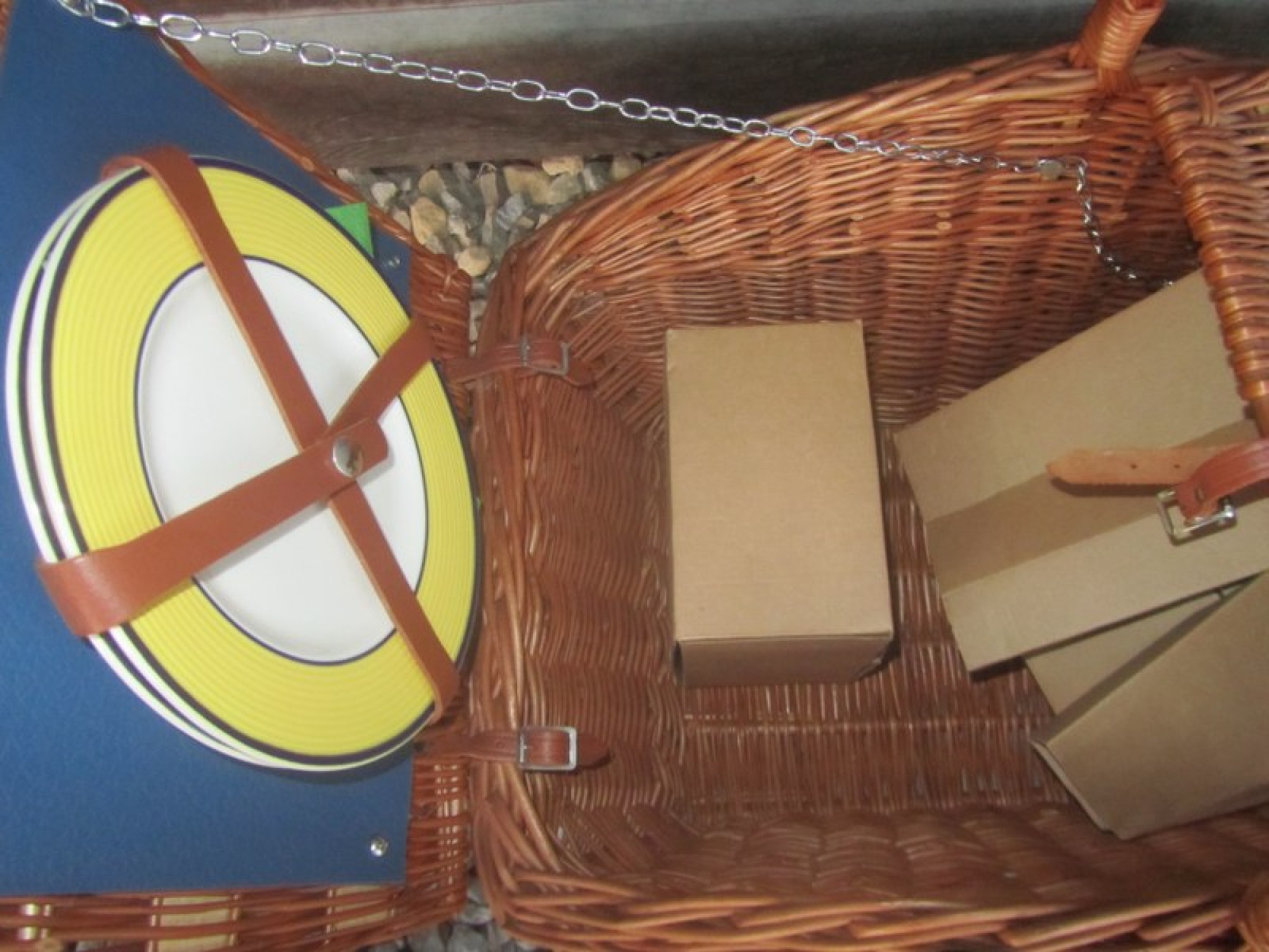 A VINTAGE STYLE WICKER PICNIC BASKET / HAMPER. LIFT UP LID. INCLUDES PLATES etc.